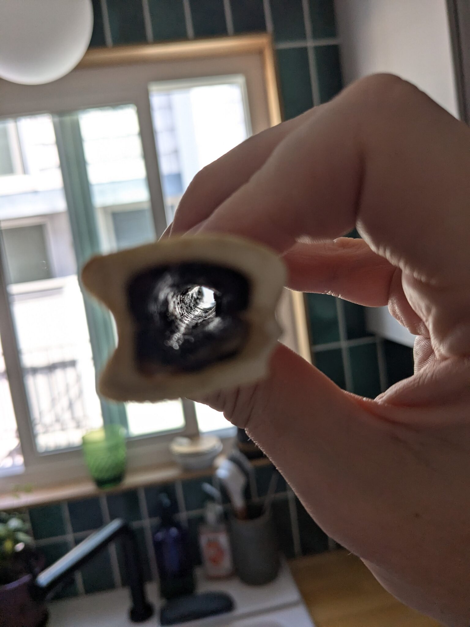 After I drilled the holes, I shaped the sound hole with a variety of small files. The idea is that it should be shaped like this (with the clay plug and wood block shown as well):