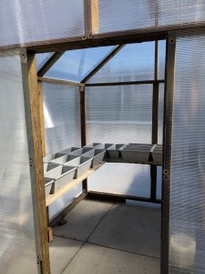 Finally, it was ready. Even without a door on it (I’ll get to it…) it’s about 10-15 degrees warmer inside the greenhouse. The 6th grade science teacher is going to use most of the space for a project but we planted a few vegetables:
