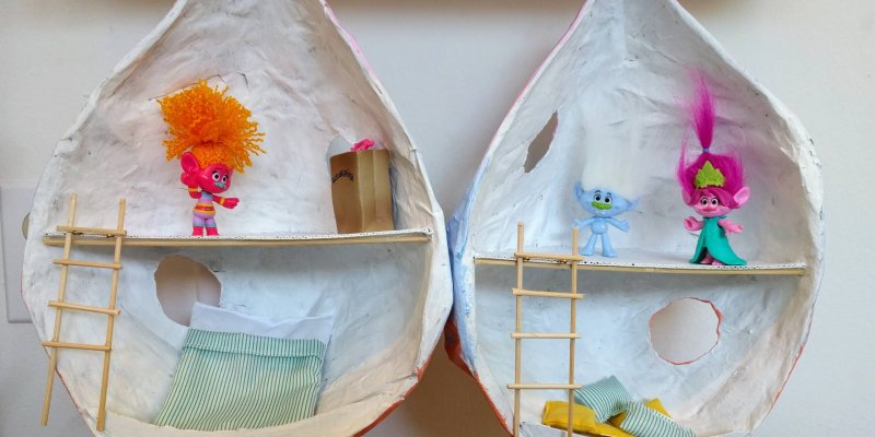 My son is in a bit of a Trolls phase. Favorite movie. Favorite song (I got this feelin’ inside my bones…). Troll figurines. Etc. He wanted to make troll pods like the trolls live in in the movie. We decided to make them via a papier maché process. Step 1: make a frame out of wire and cardboard.