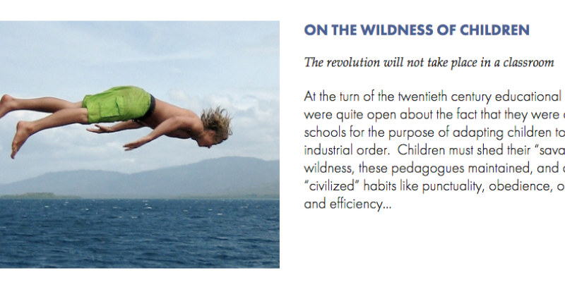On the Wildness of Children. I’m not sure ‘unschooling’ is the answer but the more time I spend working in schools the more I am convinced that a greater proportion of the school day should be devoted to free play and exploration. I can imagine a school that would strike a better balance between tr...