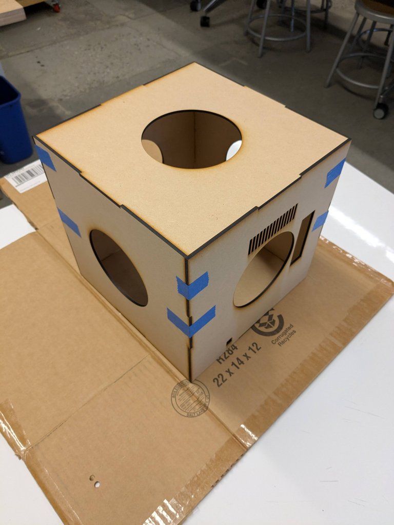 We spray painted the inner box a darker gray and then glued all the 3D printed parts on (only glueing the top parts to the top of the box so we could remove the ‘lid’).