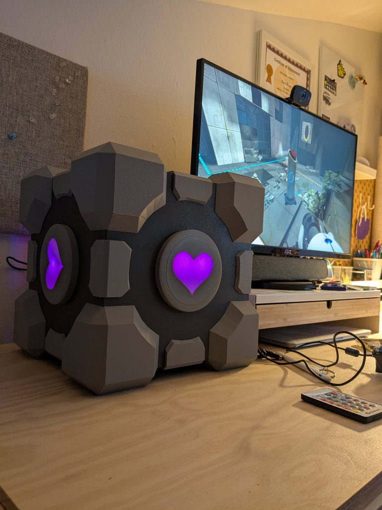 My 12yo is into retro gaming and has recently become obsessed with Portal. He decided he wanted to make a weighted companion cube PC case. We had a (very) old Mac Mini in a drawer that I’ve had since before he was born so we got it out and installed Ubuntu Linux on it. Next, he used his remarkably good vector drawing skills to make a design for the box and his 3D design skills to make the corners and edge pieces. We laser cut the box out of hardboard and glued it together (leaving the top unglued).