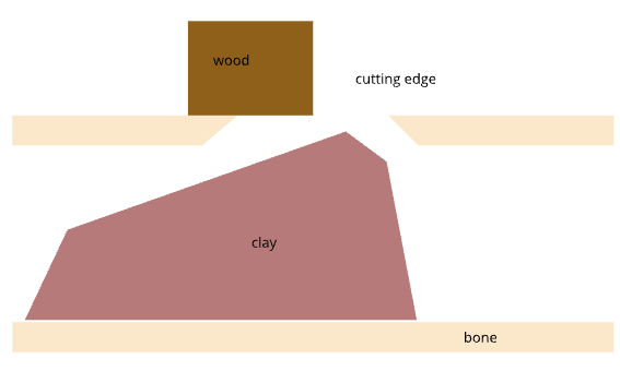 After I drilled the holes, I shaped the sound hole with a variety of small files. The idea is that it should be shaped like this (with the clay plug and wood block shown as well):