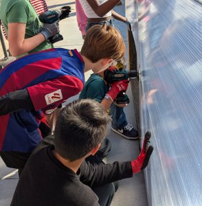 Next, we put the polycarbonate panels on with screws and washers. I used these. Drilling the screws in just far enough proved challenging for the 5th graders but we problem-solved and learned to take it slowly.