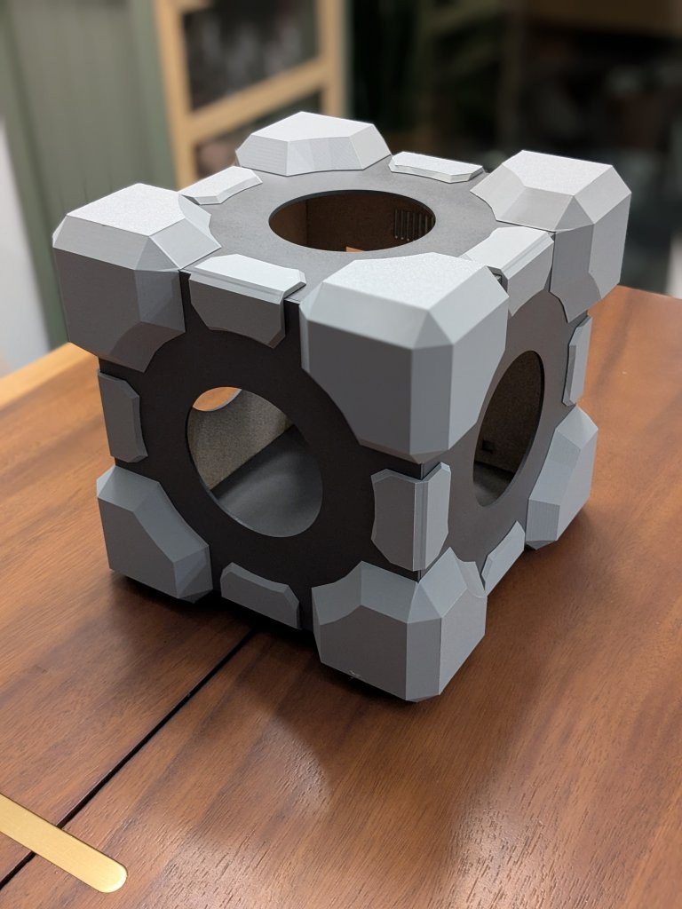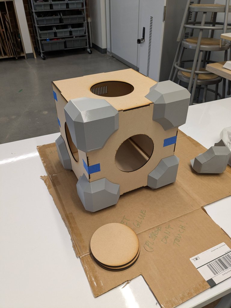 My 12yo is into retro gaming and has recently become obsessed with Portal. He decided he wanted to make a weighted companion cube PC case. We had a (very) old Mac Mini in a drawer that I’ve had since before he was born so we got it out and installed Ubuntu Linux on it. Next, he used his remarkably good vector drawing skills to make a design for the box and his 3D design skills to make the corners and edge pieces. We laser cut the box out of hardboard and glued it together (leaving the top unglued).